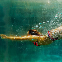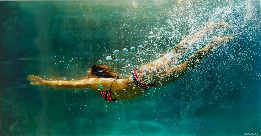 На картинке изображен человек, одетый в купальник, под водой в аквариуме. Человек, вероятно, занимается подводным плаванием или подводным плаванием, учитывая видимые ласты и воздушный бак.