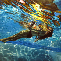 The picture features a woman swimming underwater. She is wearing a bikini and appears to be looking upwards through the water, possibly towards sunlight filtering from above. Her arms are extended in front of her, likely for balance, and her legs are tucked against her body to reduce drag while swimming. The image captures