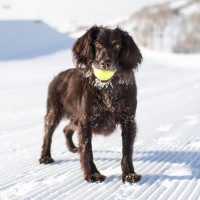 a tennis ball in its mouth and appears to be looking at the camera. The background suggests that this might be taking place during