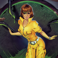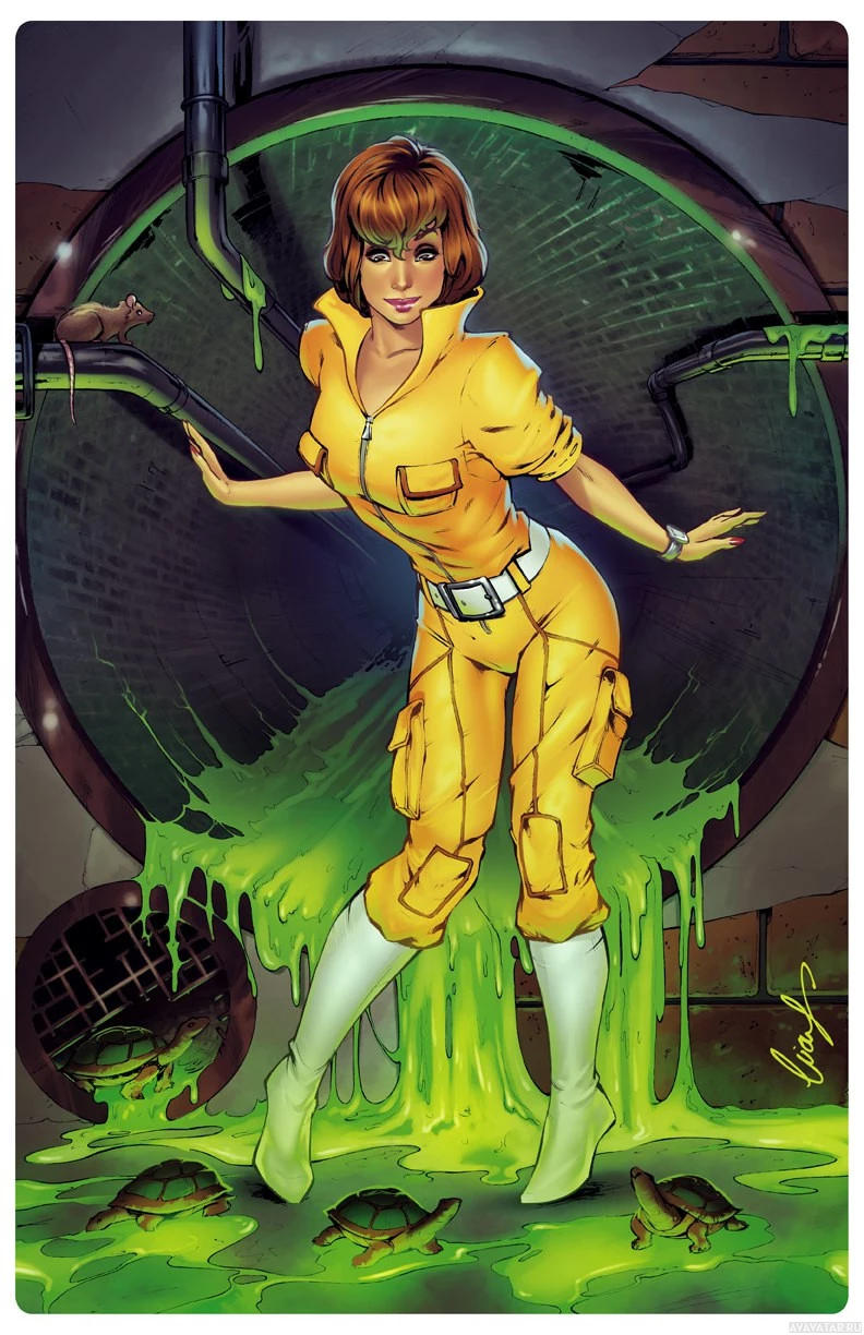 green color with what appears to be a chemical reaction or spilled substance around her feet. The artwork has a dynamic and somewhat stylized quality, indicative of comic book art or