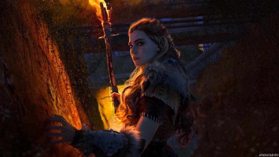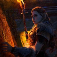a fantasy look that includes armor, a bow, and what appears to be a magical or mystical element in the form of a glowing torch.