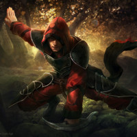 hooded clothing, suggesting an adventurous or perhaps a superhero-like persona. They are holding what looks like a staff or weapon. The background has a mystical or ancient