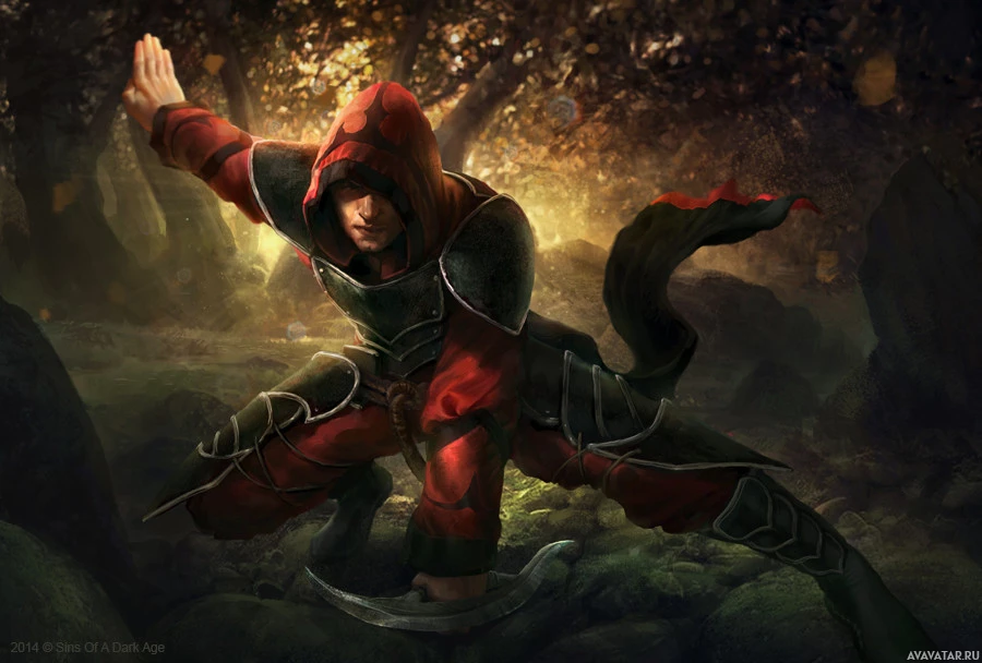 a fantasy setting, possibly inspired by popular culture. This figure is dressed in red and black armor with