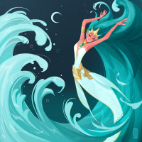 turquoise hair and is dressed in aquatic attire resembling armor, with golden accents that suggest some level of royalty or status. The mermaid is depicted riding a wave, which is rendered in hues of blue and green, giving the impression of