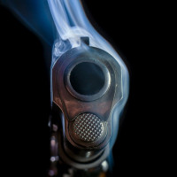Картинка показывает крупный план пистолета с дымом, исходящим из ствола, предполагая, что он был недавно выпущен. Это создает впечатление, что пистолет «курит» или горячий из-за недавнего разряда.