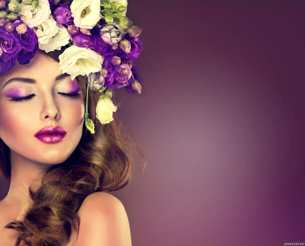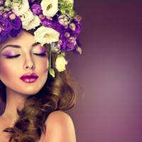 purple flowers sits on her head, which adds to the serene and artistic feel of the photograph. The background is neutral in color, focusing attention on the woman and her