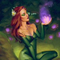 red hair and is wearing a green suit that resembles the attire of comic book or fantasy character. She appears to be sitting on a branch in what looks like