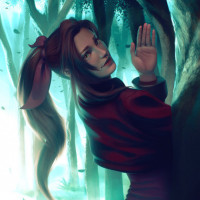 a female character standing in a forest-like environment, wearing a red outfit with a ponytail. She is looking over her shoulder, away from the viewer, and seems to be interacting with something or someone behind her back. The artwork has a mystical or magical feel due to
