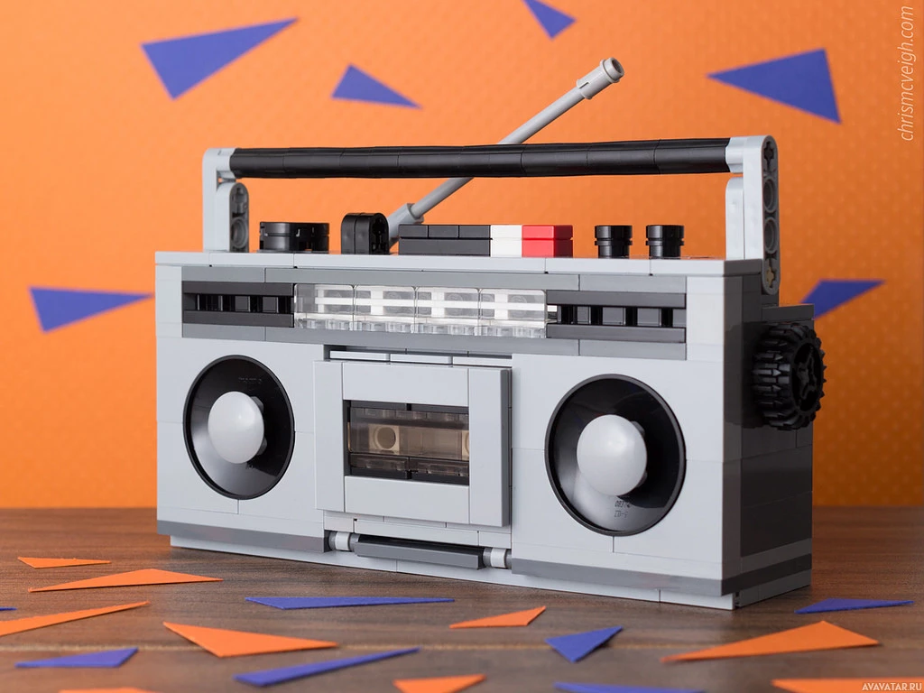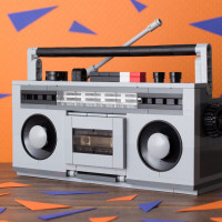 Lego bricks and features details such as sound knobs, speaker grills, and possibly other controls that are typical of a real-life boombox. This build is an example of