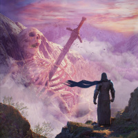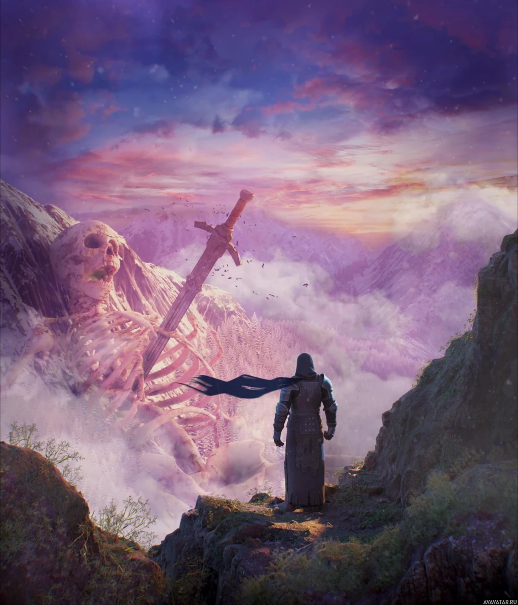 a fantasy scene where a character is standing on a rocky outcrop overlooking an expansive landscape. In the foreground, there's a sword embedded in the ground near what appears to be