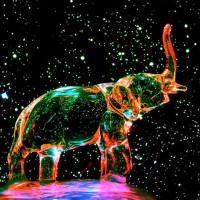 The image shows a stylized, artistic representation of an elephant. It has been digitally altered or rendered in a manner that gives it a surreal or otherworldly appearance, possibly with a neon green color scheme and a starry background.