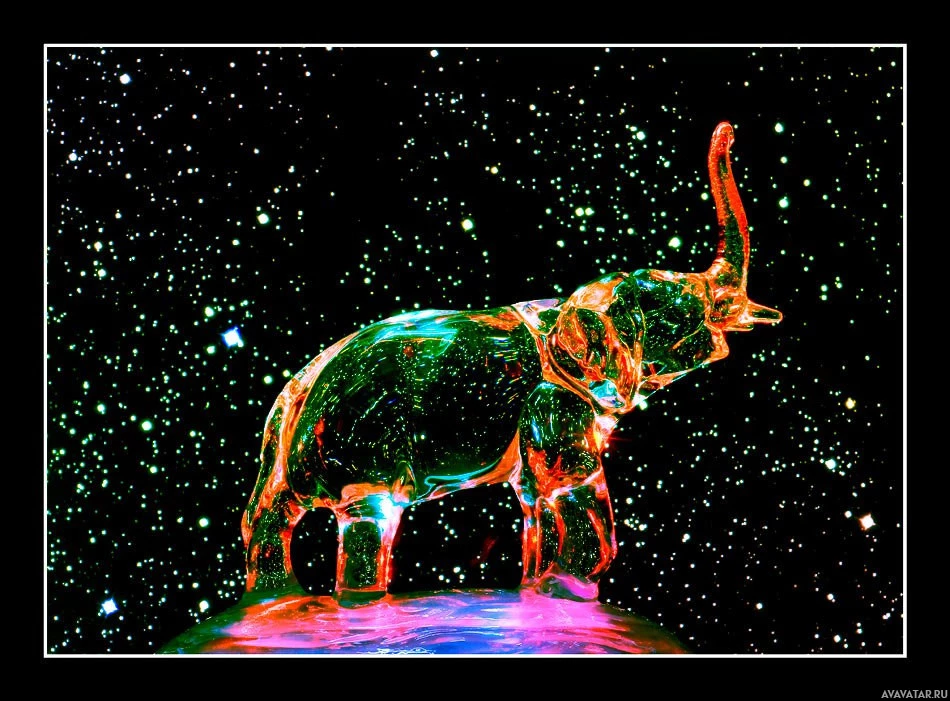 Картинка показывает стилизованное, художественное изображение слона. Он был изменен или визуализирован в цифровом виде, что придает ему сюрреалистический или потусторонний вид, возможно, с неоновой зеленой цветовой гаммой и звездным фоном.