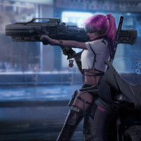 an urban environment with neon lights and advertisements visible behind her. There's also a motorcycle partially obscured by her leg on the left side of the image. The overall style of the image appears to be influenced by cyberpunk or science fiction themes, commonly seen in