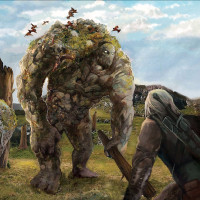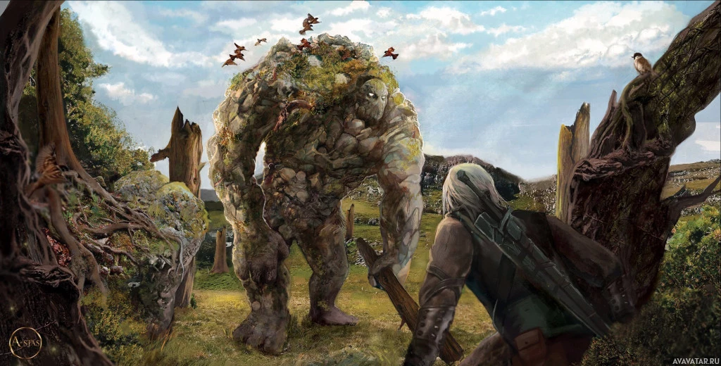 Geralt with a sword, facing off against a massive golem creature that is attacking him. The environment looks like it could be
