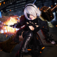 energy effects around it, suggesting she may have magical or technological abilities. In the background, there are flames and debris, indicating action or combat, which is consistent with the game's style that involves battles against robots in