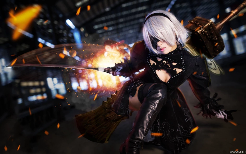 white hair and what appears to be a robotic body, wearing a black outfit with accents of red and gold. She is wielding a sword with