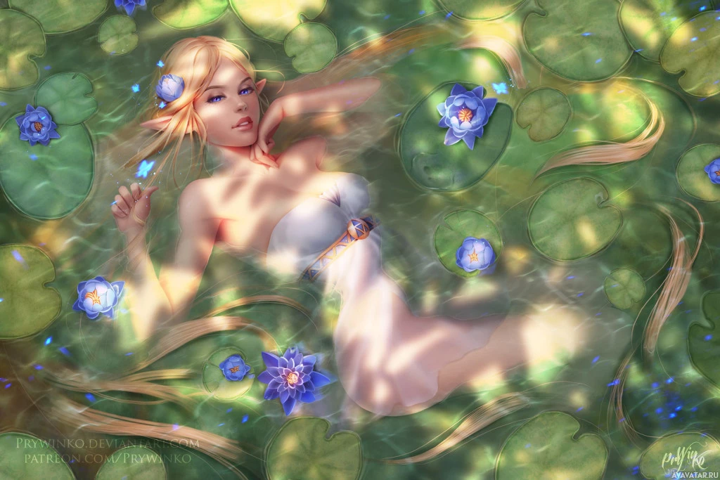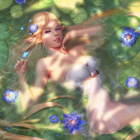 blonde hair and is lying on her back in a body of water, surrounded by lotus flowers. Her pose suggests she might be taking a nap or enjoying