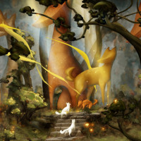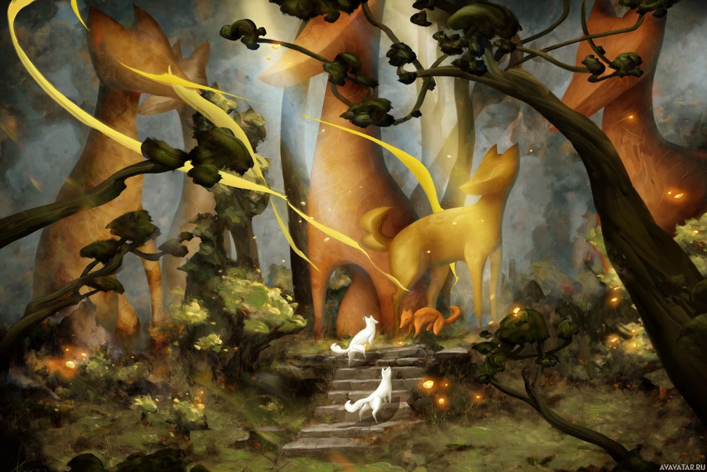 a fantastical scene with several anthropomorphic foxes. They appear to be engaged in different activities, and the environment is lush and wild, suggesting a forest or