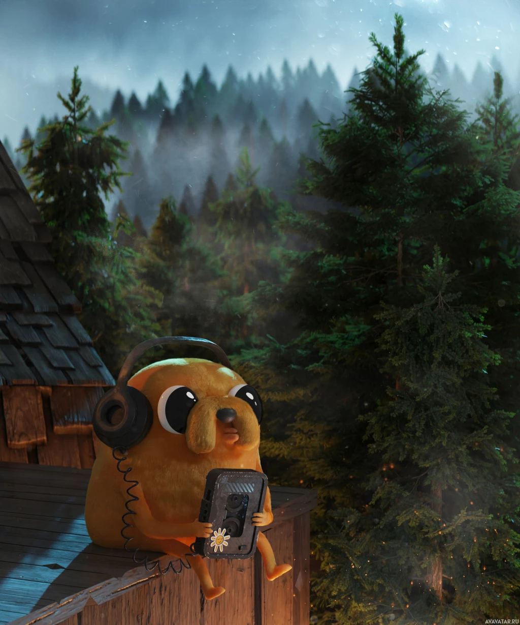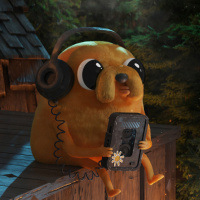 an animated character sitting on a wooden structure in what appears to be a forest or wilderness setting. The character is wearing headphones and seems to be listening to music or possibly recording something. The style of the animation suggests it might be from "