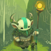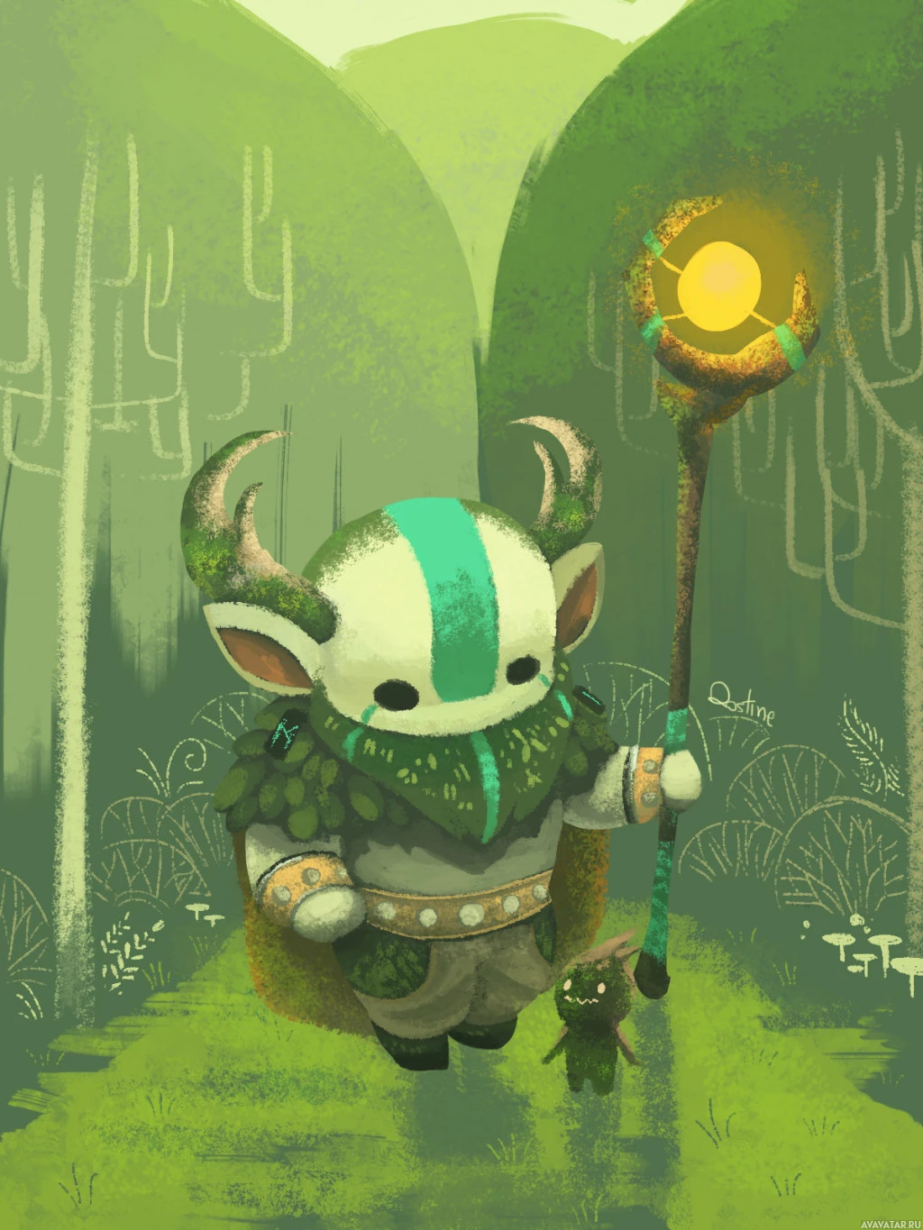 the power of nature to protect them. The character is shown in a whimsical style, wearing what looks like a green and white outfit inspired by nature, complete with a mask that gives him an otherworldly appearance. He holds a staff that has a glowing gem on top, which likely serves as a focal point for his
