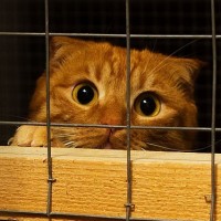 an animal shelter or pet store environment. The cat's fur is a mix of orange, black, and white, which is typical for