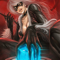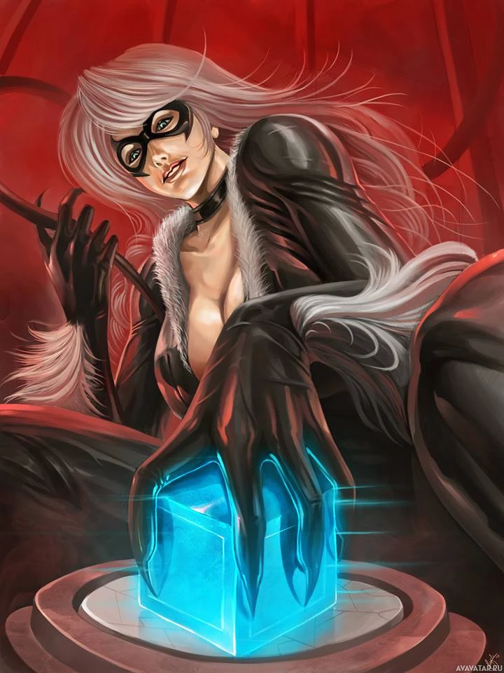 a female figure with white hair and pointed ears, dressed in a black costume with fur accents on the shoulders, hands, and boots. She has cat-like eyes and is holding