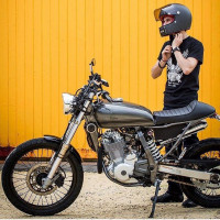 exhaust system. The background of the image features a yellow wall, which stands out against the natural tones of the man and motorcycle, making it