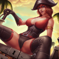 red hair and is wearing a pirate-themed outfit, including a red corset with gold accents, black boots, and is holding a sword in her hand. Her pose suggests confidence and readiness for action. The background includes