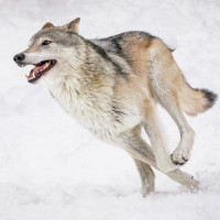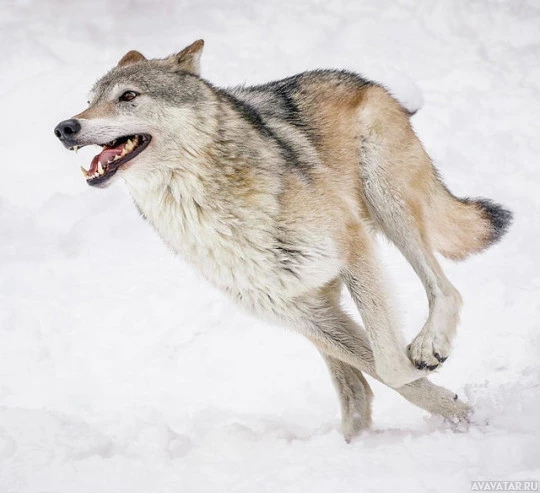 На снимке изображен волк в середине скачка по снежной местности. Она захвачена в движение, мех волка выглядит толстым и, возможно, влажным от снега. Фон — размытый белый цвет, подчёркивающий скорость движения животного по снегу.