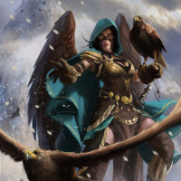 a video game or a book. The character is wearing a hood and has wings, suggesting an avian theme, possibly related to