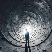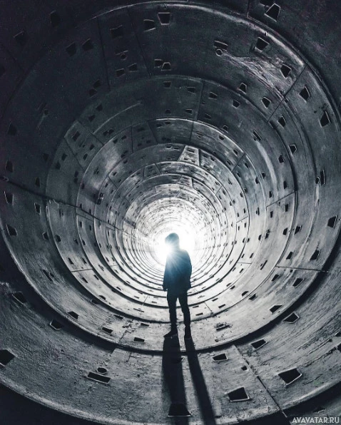 На картинке изображен силуэт человека, стоящего внутри большого круглого туннеля или трубы. Человек обращен лицом к центру конструкции спиной к камере, что создает поразительный контраст между фигурой и окружающей средой. Освещение внутри конструкции отбрасывает тени на стены, усиливая ощущение глубины и изоляции.