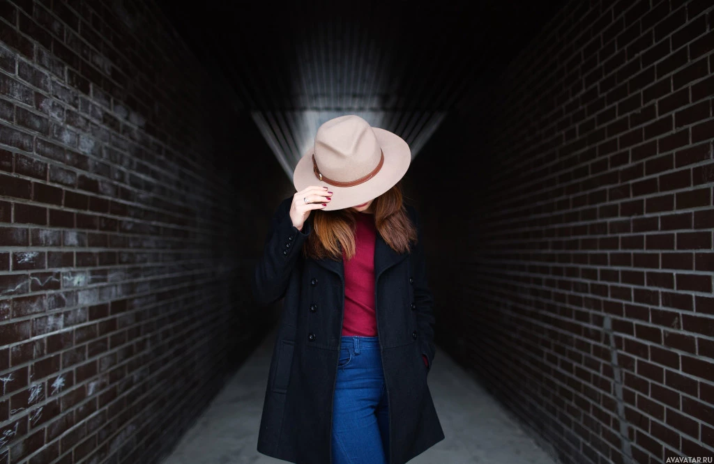 На снимке изображена женщина, стоящая у входа в кирпичное здание. На ней широкополая шляпа и длинное пальто, что указывает на прохладную или, возможно, дождливую погоду. Ее рука расположена рядом с ее лбом, что может быть попыткой защитить ее глаза от солнечного света или, возможно, она просто отдыхает там случайно. Освещение на фото придает ему несколько угрюмую атмосферу.