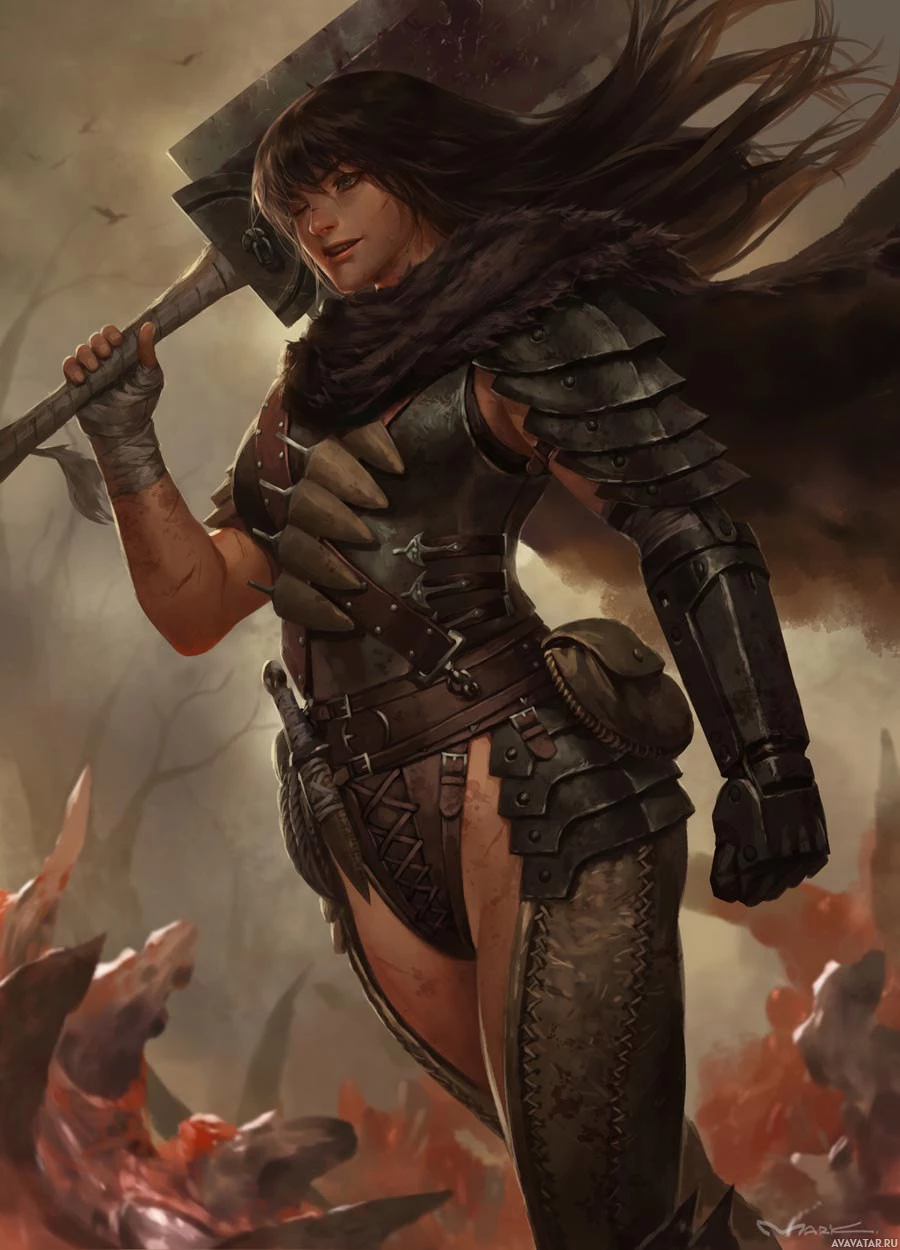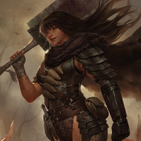 a female character who appears to be a warrior or fantasy-style heroine. She is holding a large, ornate hammer in her right hand and has a cape flowing behind her, suggesting movement or action. Her attire consists of armor pieces that look like they are made from metal and leather, with some details that could indicate she is a member of a specific faction or organization within