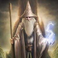 white hair, suggesting wisdom or age. They are dressed in traditional wizard attire, which includes a robe and