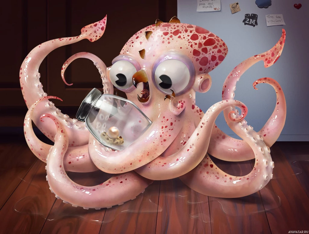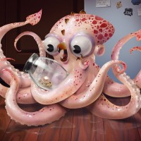 multiple tentacles and its skin appears to be pink with some yellow or orange spots. It seems to be interacting with a jar containing what appears to be
