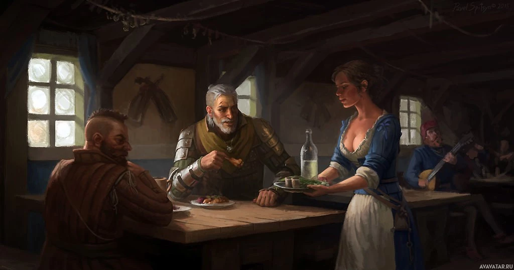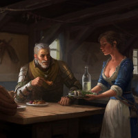 a female barmaid, can be seen attending to another patron's needs at the counter. The atmosphere is lively and social, suggesting that Geralt might be taking a break from his adventures to rest, eat, or engage in conversation with other travelers. The art style of the image closely matches the graphical design of the game, which is known for its detailed