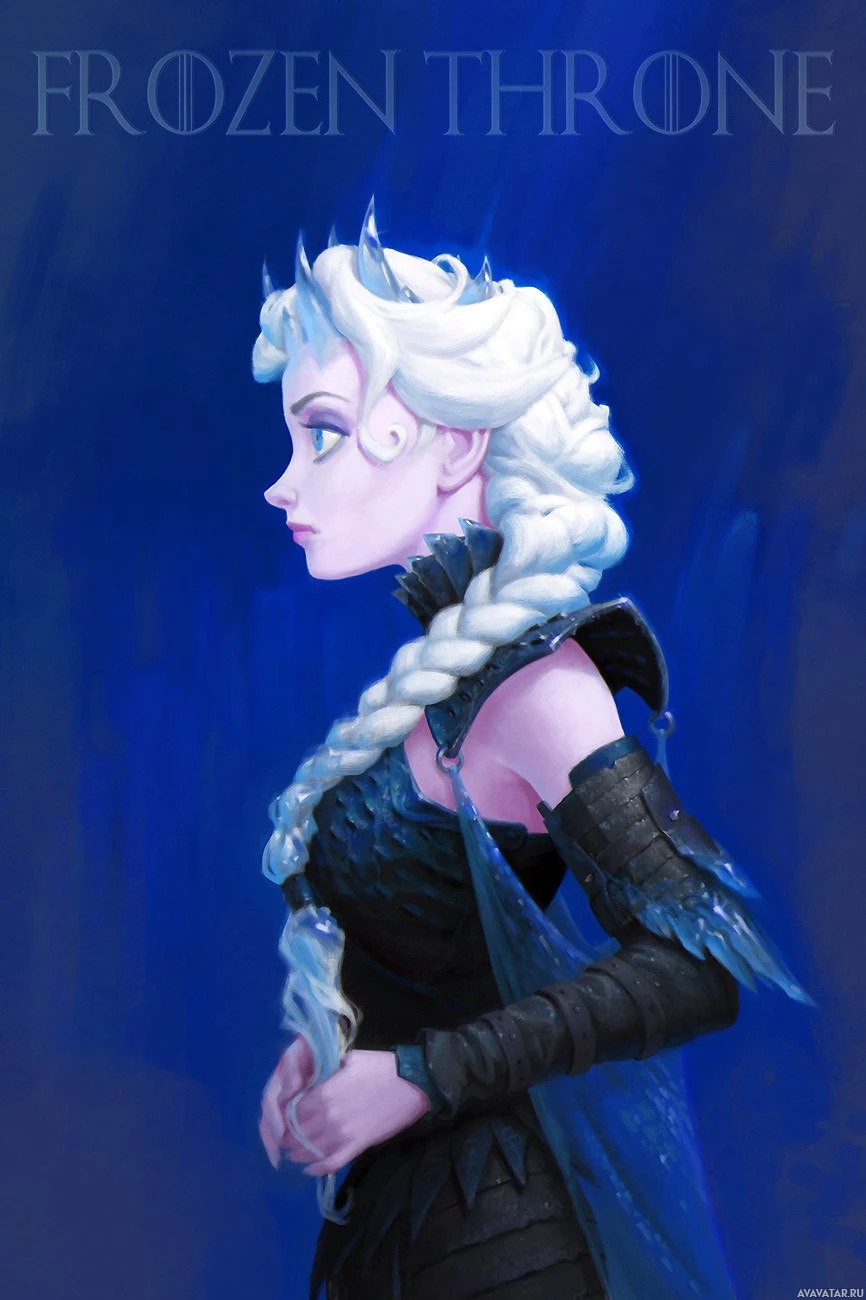 a black dress with ice-like patterns. The background is a simple gradient that goes from dark blue at the top to a light blue at the bottom, providing