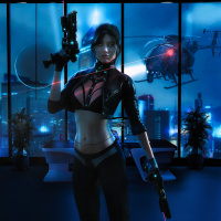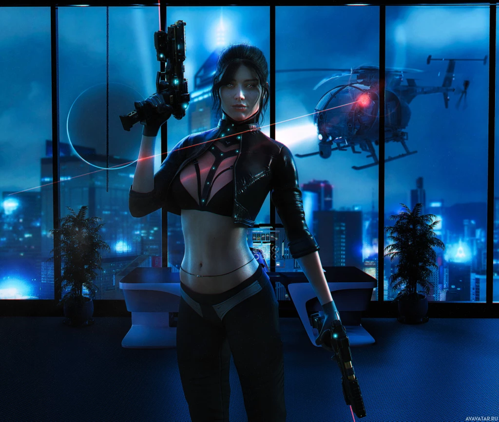 In the image, there is a woman holding a pistol. She appears to be dressed in a black leather outfit and has short