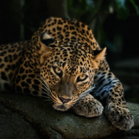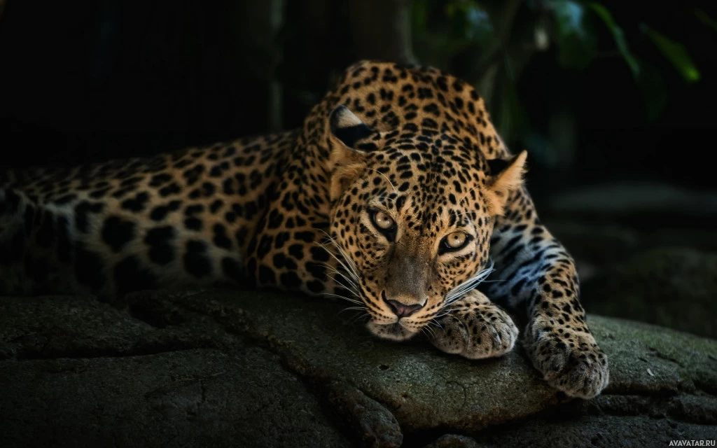 На картинке изображен леопард. Похоже, что он отдыхает или лежит, возможно, на скалистой поверхности или краю скалы, а естественная растительность на заднем плане предполагает, что он может быть в своей естественной среде обитания.