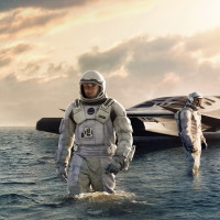 The image depicts a scene from the movie where an astronaut is standing in water alongside another individual who appears to be an astronaut as well. In the background, there's a spacecraft that seems to have landed or crashed into the body of water. This scene conveys a sense of exploration and survival against a backdrop of an alien environment.