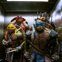 Mutant Ninja Turtles franchise, standing inside an elevator. These characters are known as Donatello, Leonardo, Michelangelo, and Raphael, and they are depicted in their
