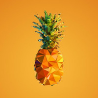 The image shows a pineapple on an orange background. The pineapple is presented with its typical green leaves and brown stem, giving it the appearance of being fresh or ripe.