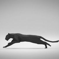 a plain background that looks like it could be a road or a plain ground surface. The panther's fur is dark and smooth, and its posture suggests movement and speed.