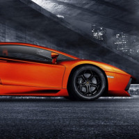 sports car, specifically an Audi R8 V10, which is known for its high-performance capabilities. The car is positioned on a paved road with city lights visible in the background, suggesting