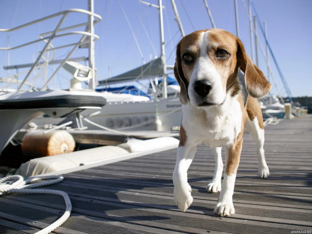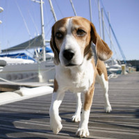 The image features a dog, specifically a beagle, standing on a dock. The dog appears to be looking at something or someone with interest or curiosity. The background consists of