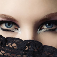 winged eyeliner, giving them an intense or dramatic look. Their eyes are looking slightly upwards and to the right, and they have