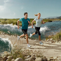 The image shows two individuals, a man and a woman, running along what appears to be a shoreline near