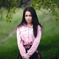 a young woman standing in what appears to be a park or garden during twilight. She has long