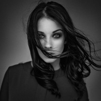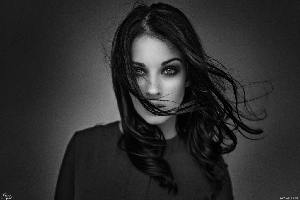 the artistic composition, which also includes her windblown hair and the contrast between the light and shadow on her face. The image has