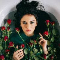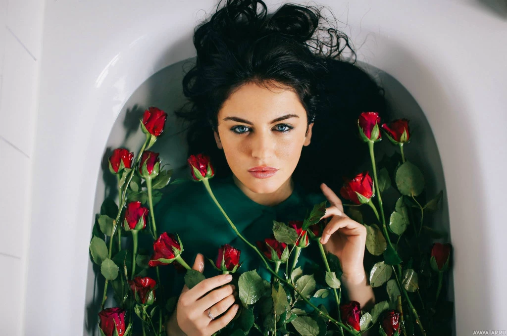 red roses, which are arranged around her neck and arms, creating an impression of being surrounded or overwhelmed by flowers. Her expression suggests a contemplative or possibly emotional state. The overall composition and lighting give the image an ethereal quality.
